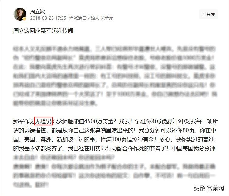 三年前的今天,即2018年8月22日,周立波在其自媒体上发表《周立波的号外:鄢军(某某)大起底》一文,对鄢军进行大起底。次日,周立波又发表《周立波回应鄢军起诉传闻》一文,称鄢军为“无脸男”。