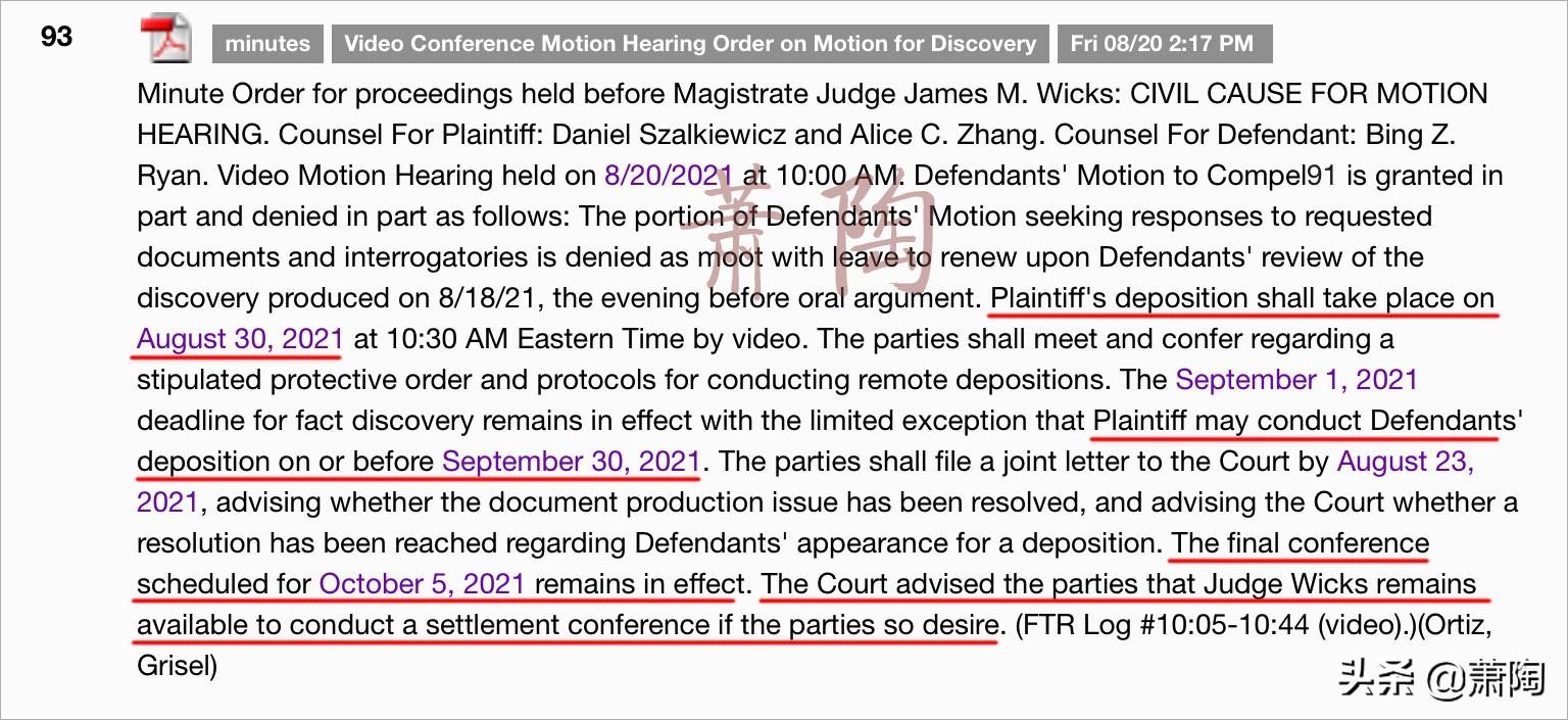 原定9月1日取证截止时间仍然有效,但有一例外,即被告要在9月30日或之前接受原告律师的问话。双方须在8月23日前向法院提交联合信函,告知法官是否已就被告接受问话达成协议。