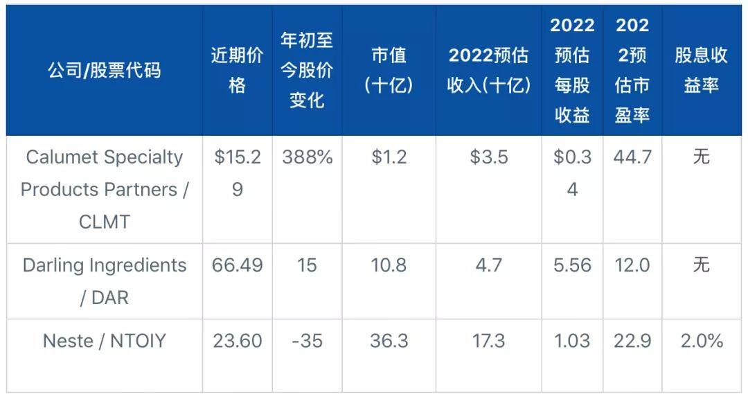 Darling Ingredients是美国最大的可再生柴油生产商之一,这在一定程度上要归功于它与炼油商Valero Energy (VLO)的一家合资企业,该公司通过路易斯安那州的一家工厂将再生动物脂肪、废弃食用油和非食用玉米油转化为柴油。路易斯安那州的工厂正在快速扩张,明年的产量可能会翻番。另一家工厂预计将于2023年在德克萨斯州投产,这家合资企业将成为美国可再生柴油生产领域的领导者,每年可生产12亿加仑柴油。这是从一个以屠宰场的“污泥”和来自13万家餐厅厨房的油脂为起点的供应链上获得的惊人收获。Darling首席执行官兰德尔 · 斯图威(Randall Stuewe)告诉《巴伦周刊》:“在低碳强度原料方面,我们有点像埃克森美孚。我们把一种不受欢迎的产品变成了液体黄金。”Tudor Pickering Holt的分析师马修•布莱尔(Matthew Blair)表示,Darling与供应链的各个环节都有联系,这使他们成为该行业“真正唯一的综合参与者”,并使其免受该行业价格波动的影响。布莱尔将该股评级定为“买入”,目标价为84美元,该股昨日收盘价为63.84美元。芬兰公司Neste也在该行业拥有长期的经验,业务遍布全球。其新加坡炼油厂于2010年开业,只生产可再生能源产品。Neste还将业务扩展到可再生航空燃料领域,这一领域的规模仍然很小,但因为航空燃料的高碳排放以及用其他方式替代它的难度很大,这可能是市场增长最快的领域之一,Neste的产品已服务于全球20多个机场。布莱尔表示:“它们在竞争中领先一大步。由于签订合同和对冲,它们的业务比一些同行更为稳定。”他将 Neste的芬兰股票评级定为买入,目标价为55欧元,这相当于美国存托凭证的价格为31美元,而美国存托凭证昨日的收盘价格为24.76美元。Calumet Specialty Products,一家拥有105年历史的印第安纳波利斯石油化工公司,也在寻求利用可持续航空燃料和可再生柴油赚钱。2012年,该公司在蒙大拿州大瀑布市收购了一家工厂。去年,高管们意识到该工厂的一部分可以用于生产沥青以外的其他用途,在此之前该工厂一度濒临出售。该公司首席执行官斯蒂芬•马维尔(Stephen Mawer)表示:“完全靠运气,大瀑布工厂是北美地区转换成可再生柴油的最佳候选工厂之一。”蒙大拿州的审批过程很快,周边地区有大量的亚麻属植物,这种作物不像大豆等其他可再生柴油原料那样被哄抬价格,马维尔说。该工厂与铁路相连,可以迅速将柴油运往西海岸和加拿大的高回报市场。加伯尔曼预计,一旦项目启动,Calumet的调整后收益将增加一倍以上。他对该股的评级为“买入”,他将该股的目标价从最近的15美元提高到23美元。 文 |《巴伦周刊》撰稿人阿维 · 萨尔兹曼(Avi Salzman)编辑 | 吴雨婷翻译 | 小彩版权声明:《巴伦周刊》(barronschina)原创文章,未经许可,不得转载。英文版见2021年12月6日报道“Want Clean-Energy Stocks? Here Are 3 That Turn Farm Products Into Fuel.”。 (本文仅供读者参考,并不构成提供或赖以作为投资、会计、法律或税务建议。)