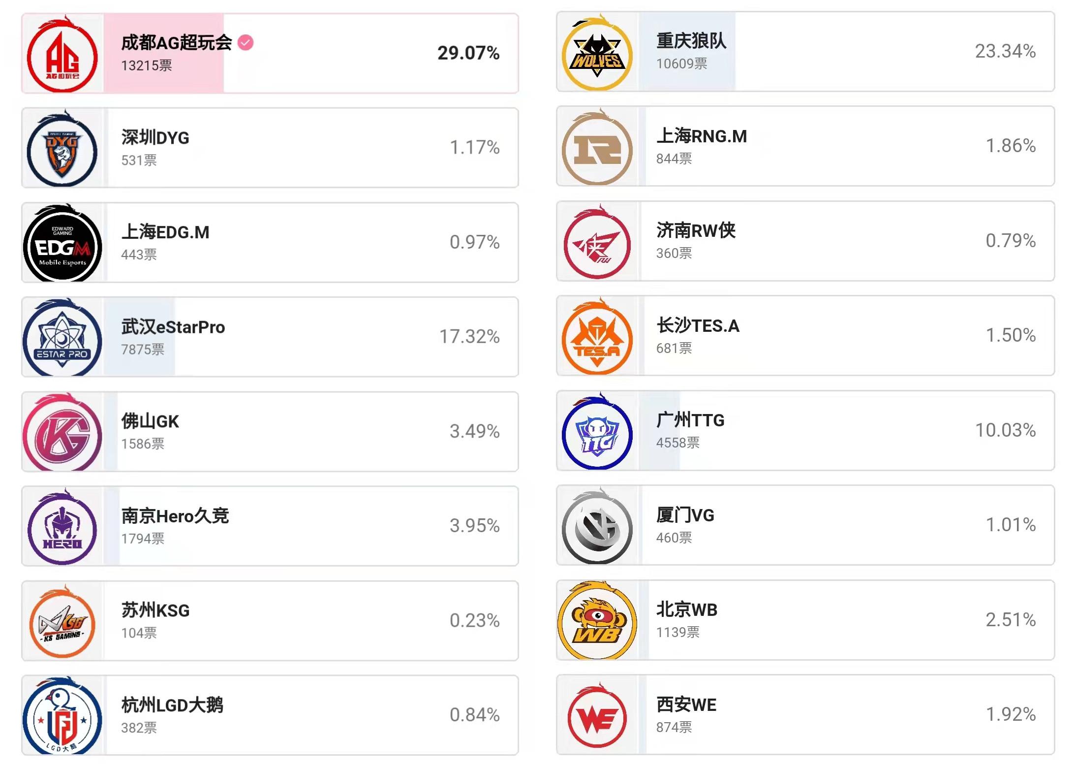 KPL秋季赛常规赛已经打了快一半了,很多队伍也都磨合得差不多了。本赛季最亮眼的队伍是武汉estarpro,他们开赛至今还未尝一败,俨然有股大魔王的味道,重庆狼队也不逞多让,而老牌强队AG超玩会的表现则有点挣扎。虽然成绩不好,但AG在人气方面还是拿捏得死死的,在最近的投票活动当中,AG和狼队占据了整个KPL人气的半壁江山。