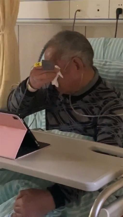 方女士拍摄的视频显示,老人坐在病床上,其面前桌子上摆放着一个粉丝外壳的平板电脑,只见老人盯着屏幕一脸悲苦神色,拿着纸巾不断擦拭眼泪。极目新闻记者注意到,老人的右手手指上,还带着一个检测仪器。