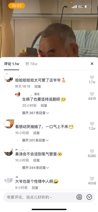 在发布上述视频时,方女士还配文写道:皮氧低报警还吓一跳,原来是看电视给整激动了。该视频也很快引发网友热议,有网友笑称“看感动哭抽抽了,一口气上不来”,还有网友评论道“太可爱了,大爷也是性情中人啊”。