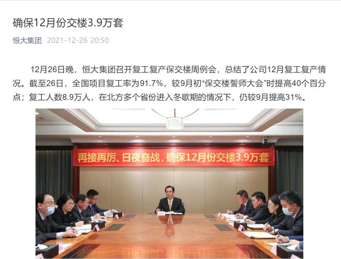 恒大集团微信公众号26日发布消息,12月26日晚,恒大集团召开复工复产保交楼周例会,总结了公司12月复工复产情况。截至26日,全国项目复工率为91.7%,较9月初“保交楼誓师大会”时提高40个百分点;复工人数8.9万人,在北方多个省份进入冬歇期的情况下,仍较9月提高31%。