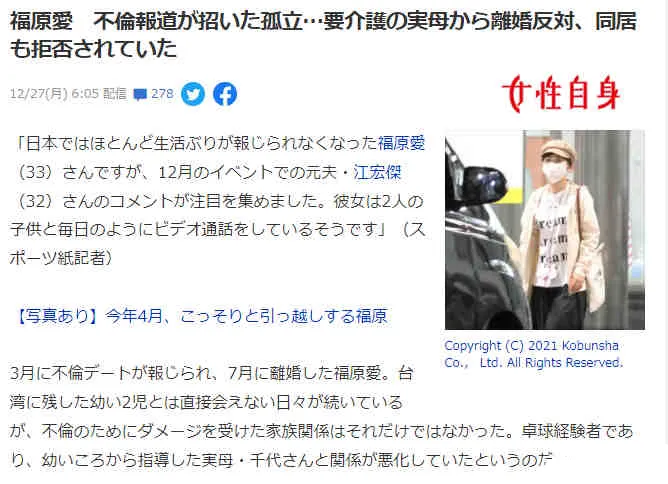 正文 福原爱母亲拒绝与女儿同居(福原爱妈妈) kpjjhadmin V管理员 /2021-12-27 20:45:13 /111 阅读 1227 据日媒,福原爱的妈妈原本和福原爱一起在台湾生活,今年在福原爱回到日本以后没多久,她也搬回了日本。福原爱的母亲一直坐着轮椅,需要人照顾生活,福原爱也表示想和妈妈一起住,帮忙照顾,但是遭到母亲的拒绝。据悉,福原爱的妈妈一直很喜欢江宏杰,非常反对他们离婚。 声明:本文内容及图片来源于读者投稿,本网站无法甄别是否为投稿用户创作以及文章的准确性,本站尊重并保护知识产权,根据《信息网络传播权保护条例》,如果我们转载的作品侵犯了您的权利,请在一个月内通知我们,我们会及时删除。请将本侵权页面网址发送邮件到laoyang1981@qq.com,我们会及时做删除处理。