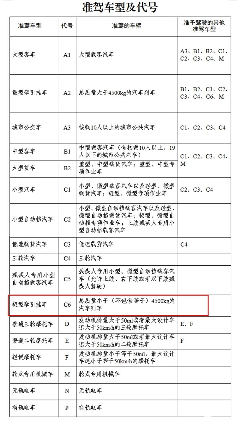 在驾照新规中,可以看到准驾车型及代号增加了轻型牵引挂车的类别,代号为C6,定义是总质量小于(不包含等于)4500kg的汽车列车。这个范围很明确地规定在了轻型汽车列车中,包含皮卡以及其他乘用车在拖车时的状态。那么该如何取得这个驾驶资格呢?笔者经过仔细地梳理,得出了具体的结论。