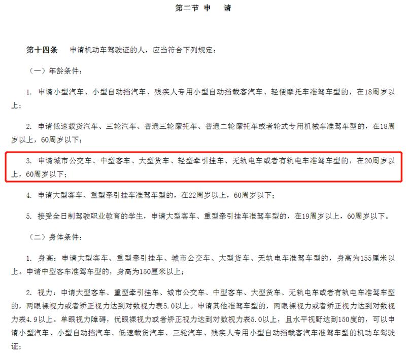 首先在申请方面,新规中明确规定申请轻型牵引挂车的需要在20周岁以上,60周岁以下,对年龄有所要求。在后期的发证、换证、补证环节中也明确规定,持有重型牵引挂车驾驶证的,60周岁以上还可以保留轻型牵引挂车准驾车型。但年龄在70周岁以上的持有驾驶证包含轻型牵引挂车准驾车型的,应当换领准驾车型为小型汽车或者小型自动挡汽车的机动车驾驶证。