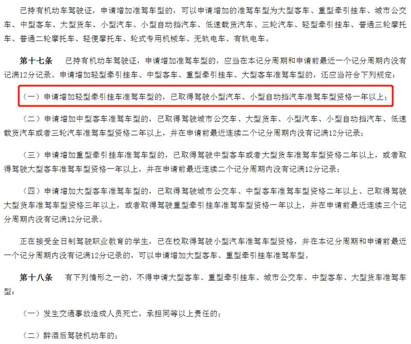 其次是申请过程方面,C6驾照不能首次申领,也就是说不能第一次考驾照就考轻型牵引资质。新规第十六条规定,已持有机动车驾驶证,申请增加准驾车型的,可以申请增加的准驾车型包含轻型牵引挂车,并且应当在本记分周期和申请前最近一个记分周期内没有记满12分记录。而且申请增加轻型牵引挂车准驾车型的,必须是已取得驾驶小型汽车、小型自动挡汽车准驾车型资格一年以上才可以。
