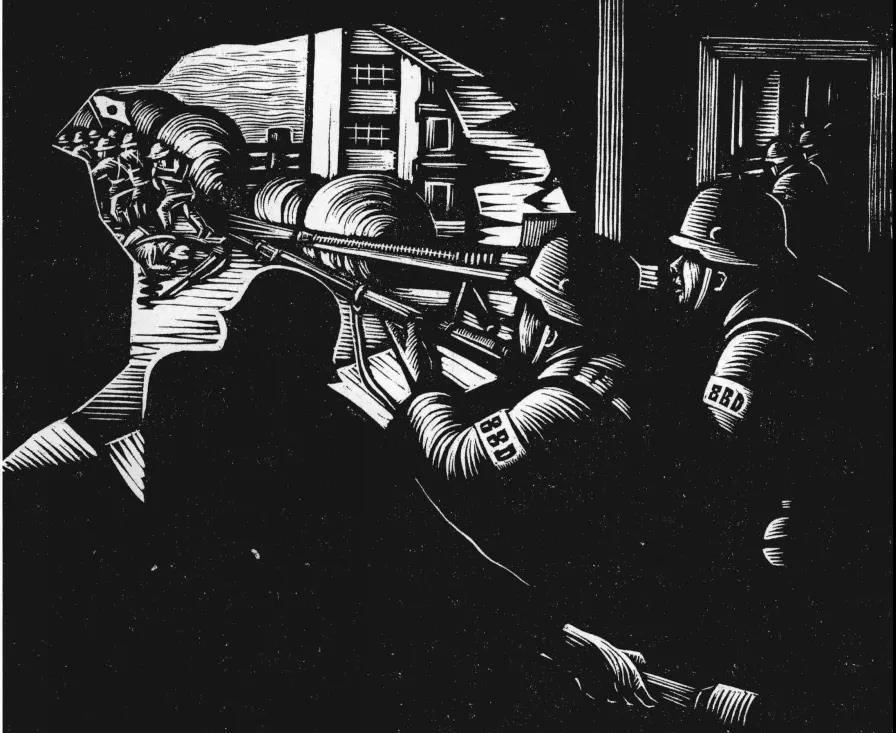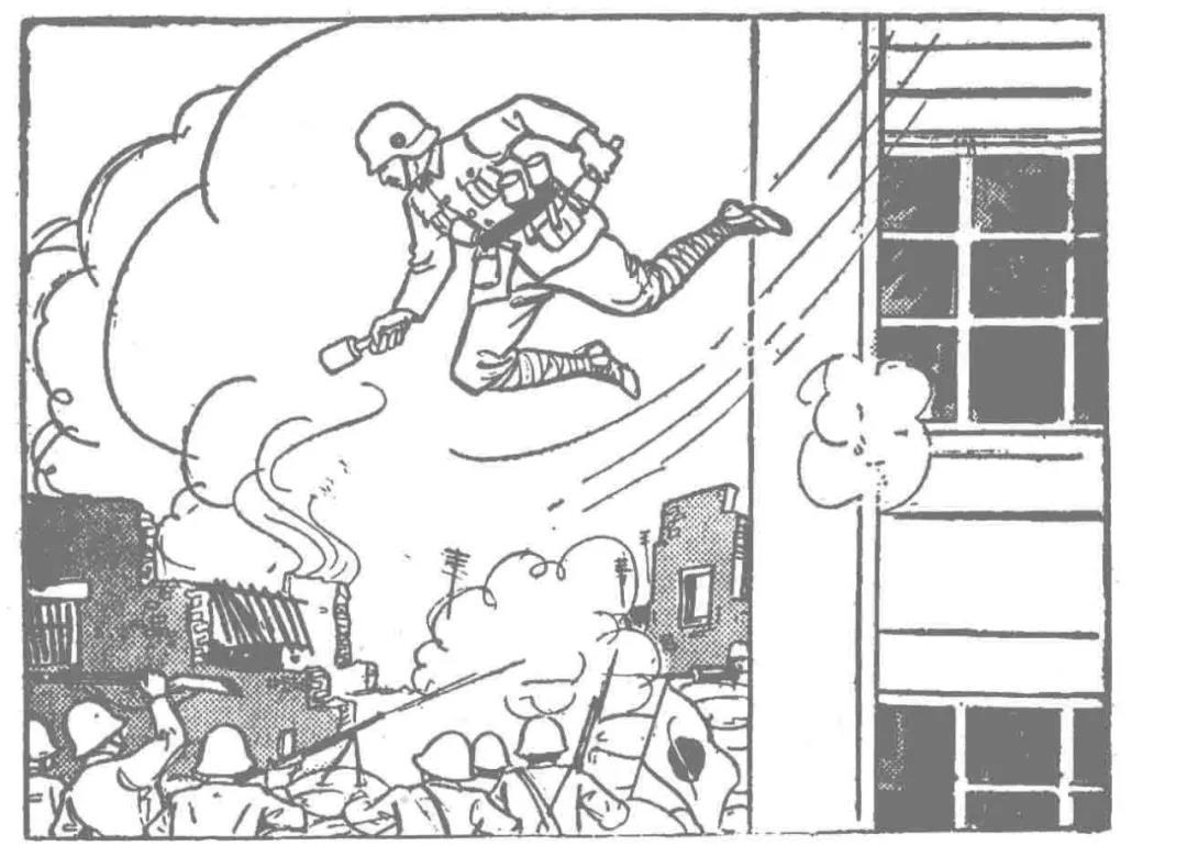 赵景深编《八百好汉死守闸北》中的插图,一名战士身绑手榴弹从楼上跃下,与敌人同归于尽。