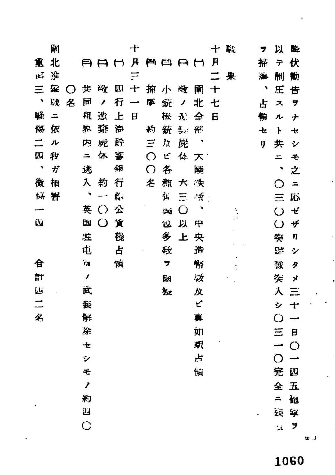 上海海军特别陆战队司令部整理的战报《支那事变上海战迹案内骨子》中“闸北进击战”中登记战果的一页。写明中方留下100具尸体,而日军总计伤42人。在这份报告的前一页写着中方军队人数为800名。