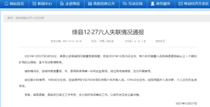 2021年12月27日3时54分,山西绛县公安局接到河南籍李某报警,称在2021年12月23日左右,有六名河南籍人员到绛县里册峪山上一个疑似矿洞的山洞后,至今无法取得联系。