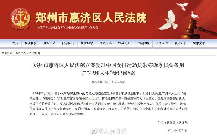 朱婷要求以诽谤罪追究5名网友刑责#据郑州市惠济区人民法院:2021年12月3日,自诉人朱婷委托的诉讼代理人到我院提交刑事自诉状及证据材料,以今日头条用户“排球人生”、“顽童说球”、“柯南话乒乓”和微信订阅号“排球Dialogue”、新浪微博ID“第一球迷胖哥”5人捏造事实、通过网络诽谤自诉人朱婷且情节严重为由,要求以诽谤罪追究5被告人的刑事责任、赔礼道歉并赔偿有关财产损失。我院审查过程中,通知自诉代理人补充了相关证明材料,依职权调取了有关证据。经审查,朱婷的自诉符合《中华人民共和国刑事诉讼法》相关规定,我院于2021年12月27日依法立案。(来源人民日报)
