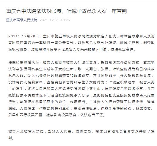 据重庆市高级人民法院12月28日消息,重庆市第五中级人民法院依法对被告人张波、叶诚尘故意杀人及刑事附带民事诉讼一案进行一审公开宣判,以故意杀人罪判处张波、叶诚尘死刑,剥夺政治权利终身;对刑事附带民事诉讼原告人陈某某的撤诉申请,依法裁定准许。