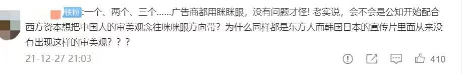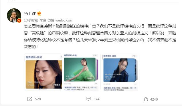 质疑奔驰广告“故意的”还有微博账号@马上评 ,他在微博上称:我们不是批评模特的长相,而是批评这种刻意“高级脸”的吊稍妆容,批评这种刻意迎合西方对东亚人的刻板定义!所以说,奔驰你给模特化这种妆不是有病?这几天雄狮少年到三只松鼠闹得这么凶,我不信奔驰不是故意的!