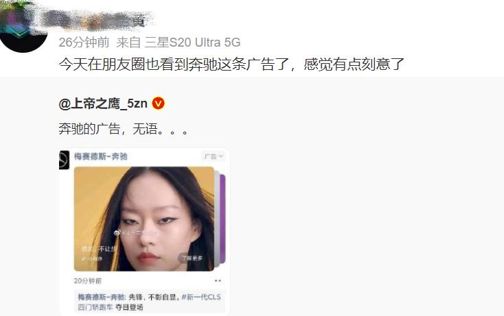 也有网友指责“这群人在PUA中国消费者”,还有网友说,在朋友圈收到奔驰的这组“眯眯眼”广告推送,并称“感觉有点刻意了”。↓
