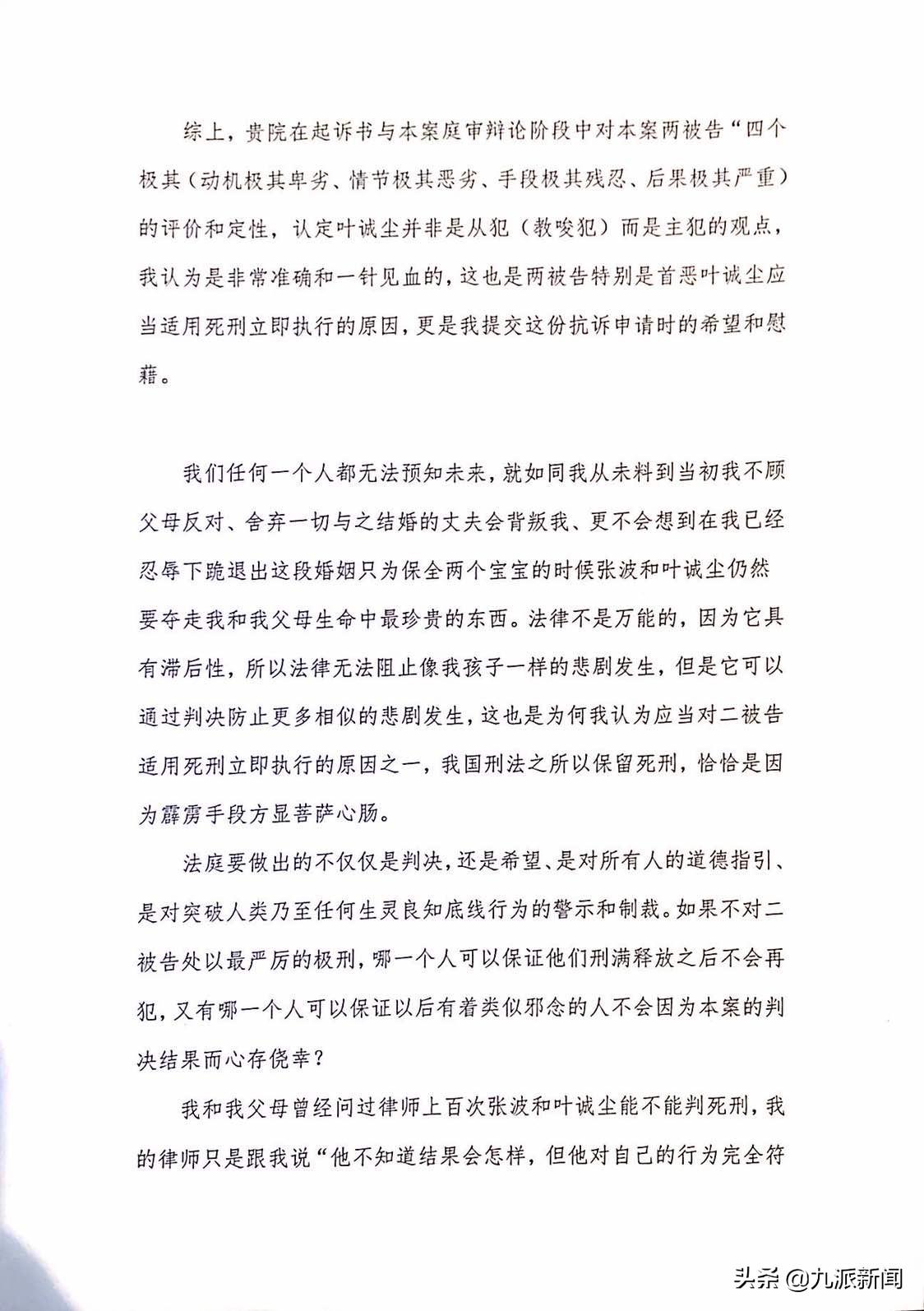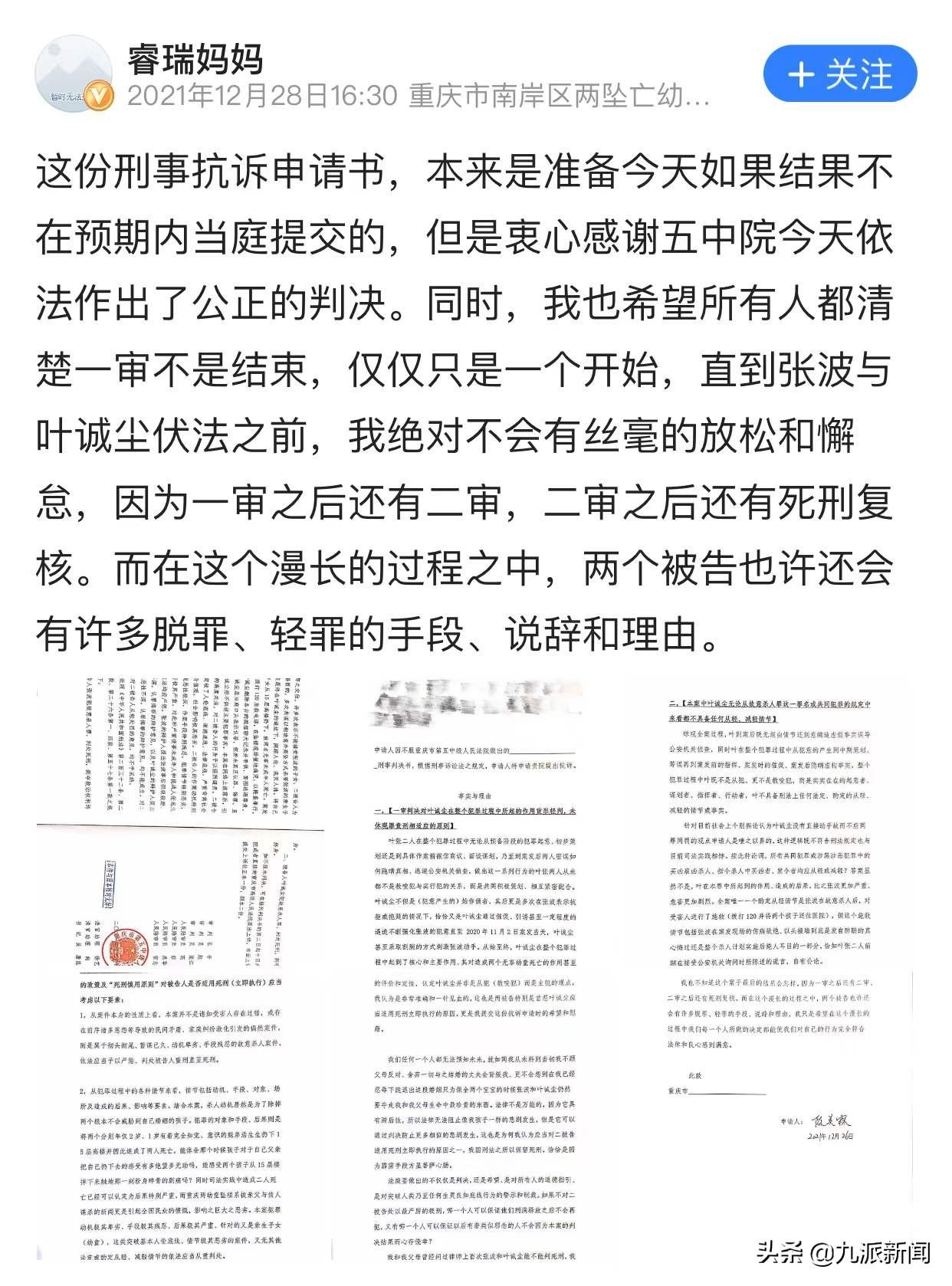 12月28日下午,孩子们的生母陈某霖在社交平台发文,称:一审不是结束,直到张波与叶诚尘伏法之前,绝对不会有丝毫的放松和懈怠,一审之后还有二审,二审之后还有死刑复核,两个被告也许还会有许多脱罪、轻罪的手段、说辞和理由。