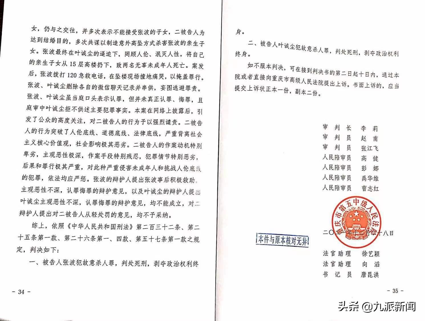 据重庆市高级人民法院消息,2021年12月28日,重庆市第五中级人民法院依法对被告人张波、叶诚尘故意杀人及刑事附带民事诉讼一案进行一审公开宣判,以故意杀人罪判处张波、叶诚尘死刑,剥夺政治权利终身;对刑事附带民事诉讼原告人陈某某的撤诉申请,依法裁定准许。