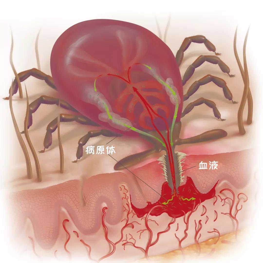 接着蜱虫一边分泌唾液一边吸食血液,蜱虫身上携带的病原体通过唾液传染给受害者,狗狗或人身上可通过血液传播的疾病病原体通过血液寄宿在蜱虫身上进而在蜱虫找到下一个受害者后传染给下一个受害者。