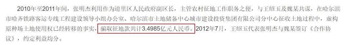 紧接着,2021年11月17日上午,黑龙江省哈尔滨市中级人民法院对哈尔滨市城镇化建设领导小组办公室原主任张明杰受贿、滥用职权,同案被告人王绍玉受贿一案进行公开宣判,以受贿罪判处张明杰无期徒刑,剥夺政治权利终身,并处没收个人全部财产;以滥用职权罪判处张明杰有期徒刑十年,决定执行无期徒刑,剥夺政治权利终身,并处没收个人全部财产。