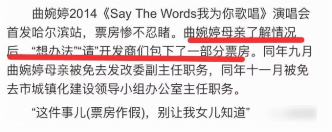 时间一晃来到了2014年,张明杰坐到了发改委副主任的席位,同年在歌坛有了一些名气的曲婉婷决定举行“全球巡回演唱会”。首发站定在了家乡哈尔滨。 当夜万人体育场座无虚席,曲婉婷身着华服“闪亮登场”。