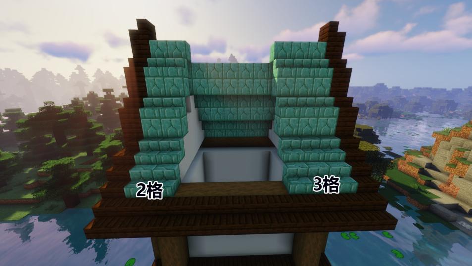 在如图位置用去皮云杉原木,向上搭建5格并相连,用白色混凝土填充墙壁,并将深色橡木楼梯放在柱子的底部,用台阶将其相连。