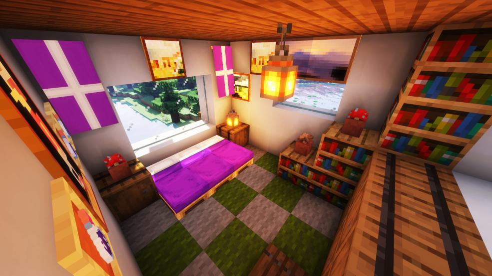 原先的沼泽小屋没有休息的地方,方块菌贴心地将2楼改造成了卧室,增加床,书架,用木桶作为床头柜。