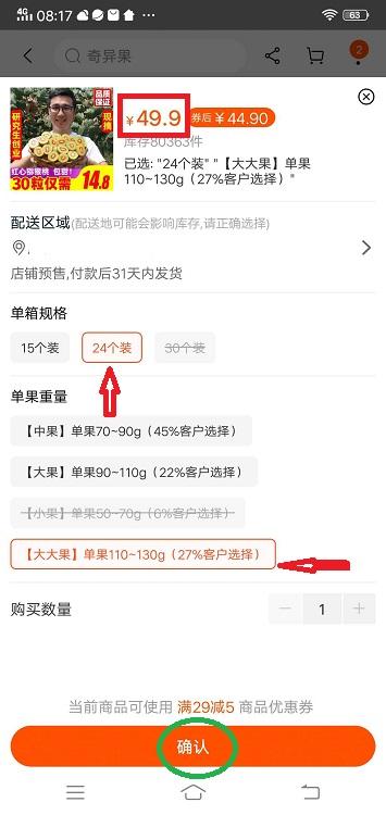 例3:四川红心猕猴桃,24个,大果!价格:49.9元,点“确认”!进入购物车!