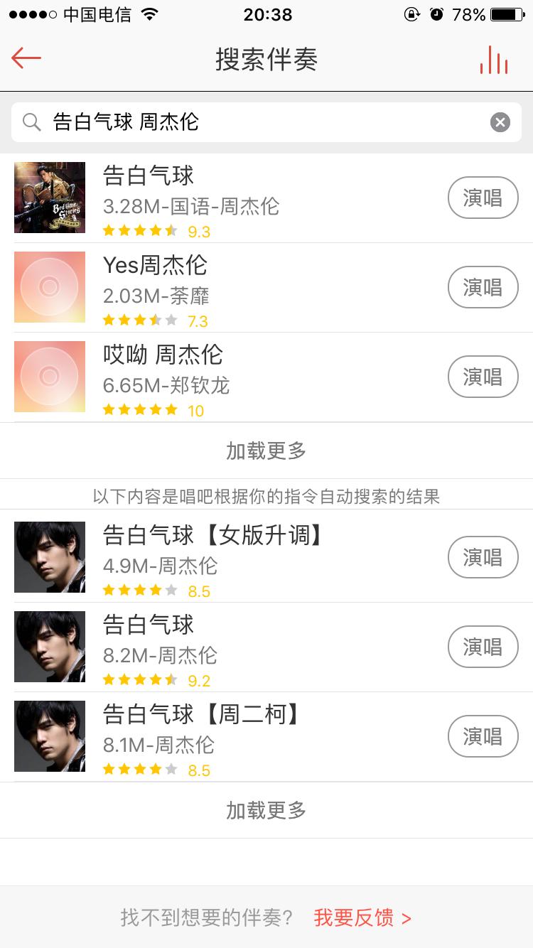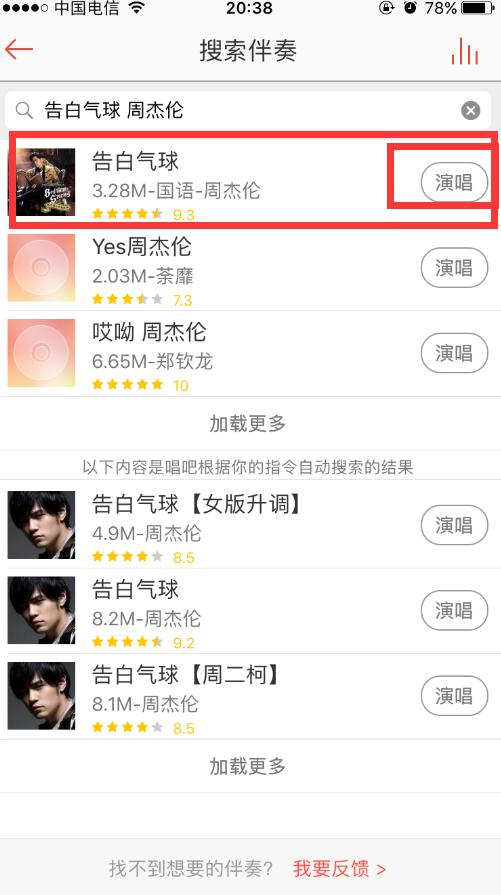 搜索后会弹出几个版本,毫无疑问选择周杰伦国语版本,直接选择右边的演唱。