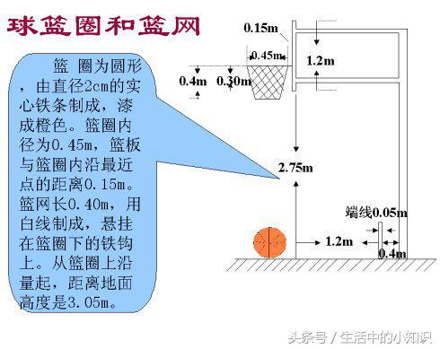 具体来讲,国际篮联标准为整个篮球场地长28米,宽15米。长宽之比为28:15,同时篮圈下沿距地面3.05米。