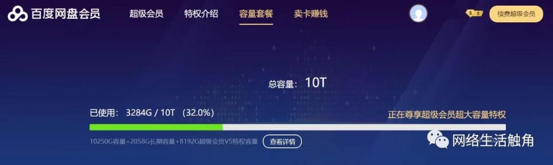 网盘容量:非会员10G(0.001T),免费空间太小,升级到超级会员基本容量达6000G(6T),并根据会员时限赠送一定容量。