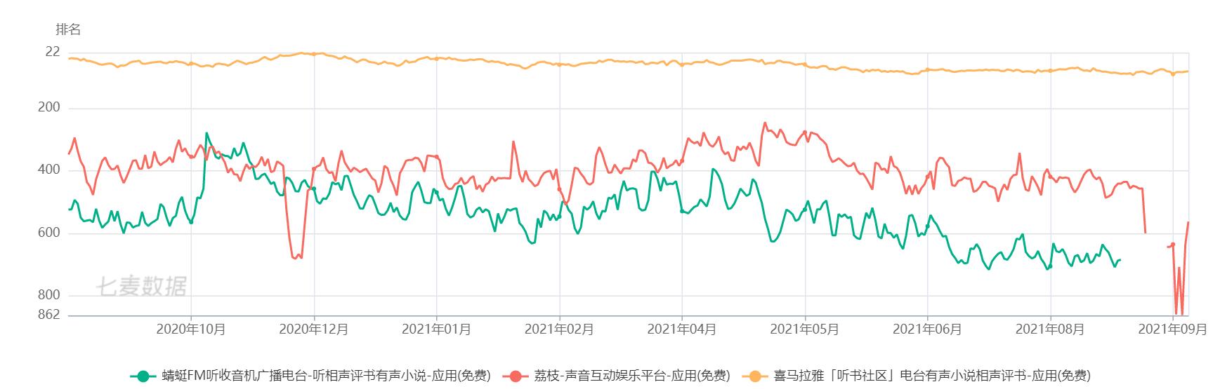 在App Store中的排名方面,七麦数据显示,最近一年内,喜马拉雅在App Store应用免费榜的排名多数时期都位于前100名内,荔枝则位于200——600名左右,蜻蜓FM位于300——700名之间。