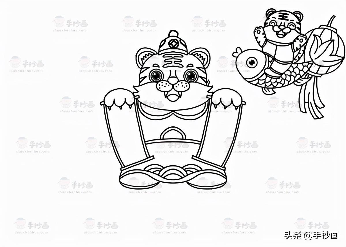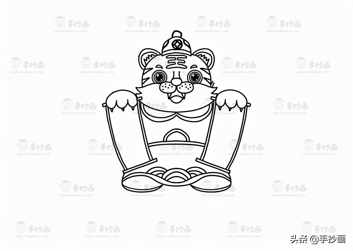 4、开始上色啦,给两只小老虎涂上喜庆的红色衣服,小老虎的身子图上黄色