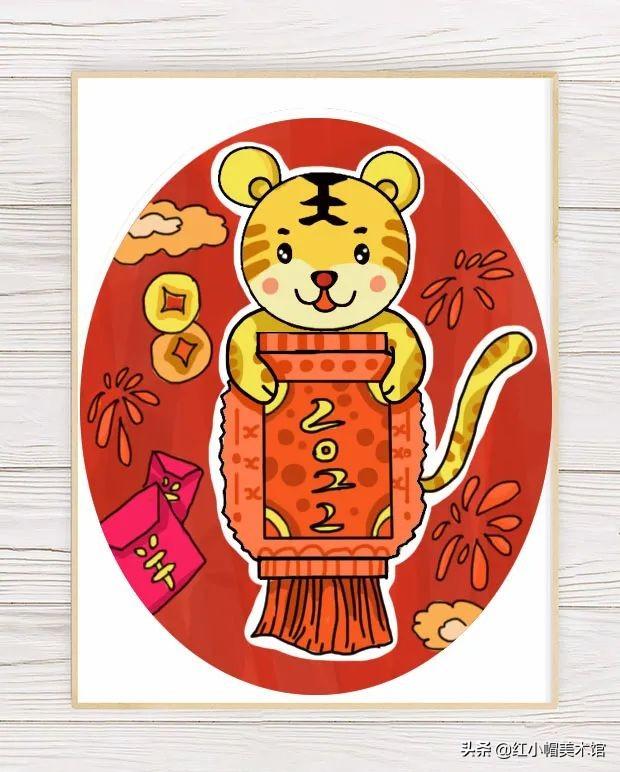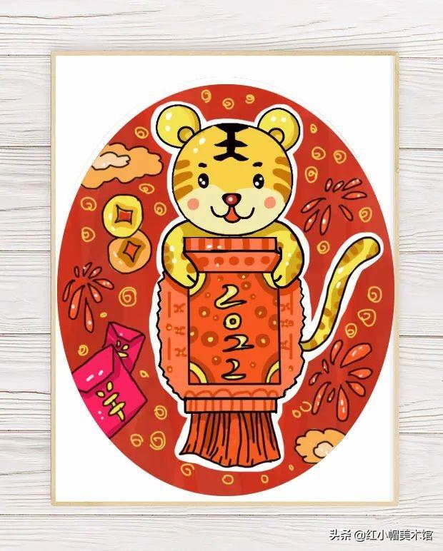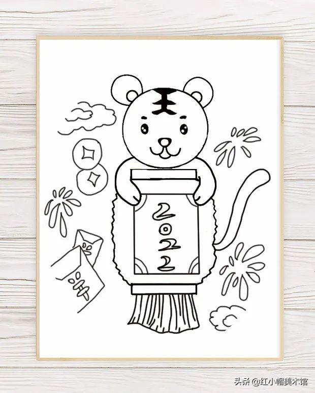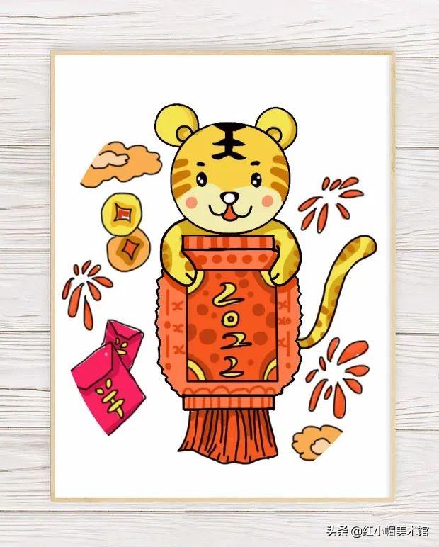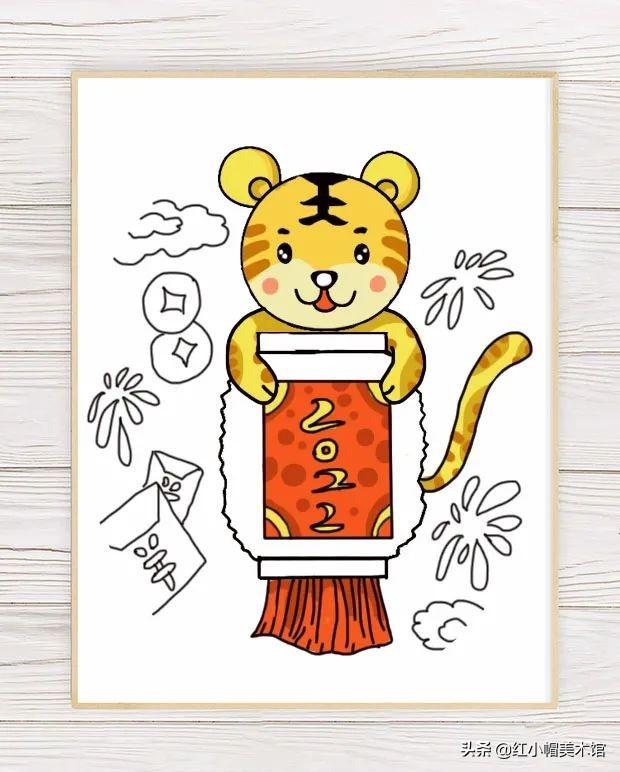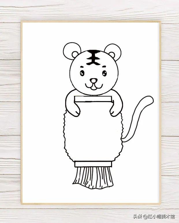 1·画一只小老虎抱着一个灯笼,小老虎可以戴上围巾帽子