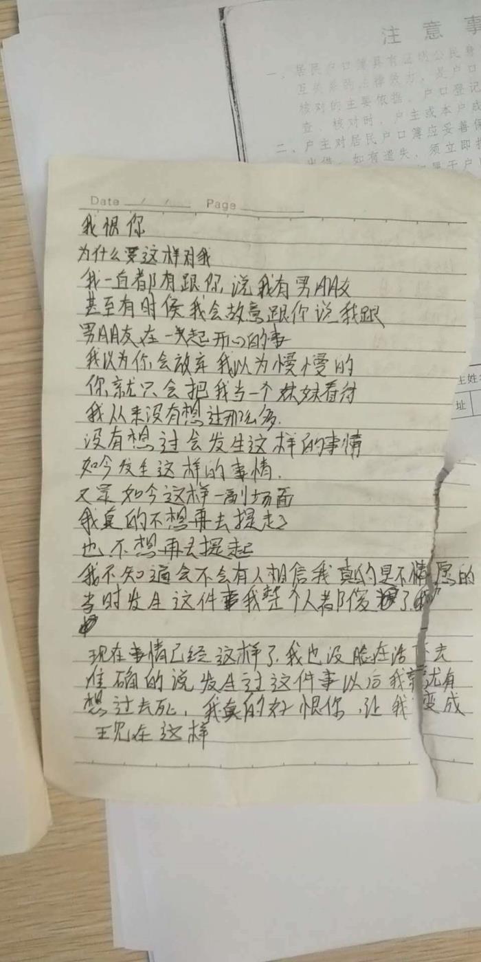 “我恨你/为什么要这样对我/我一直都有跟你说我有男朋友/甚至有时候我会故意跟你说我跟男朋友在一起开心的事/我以为你会放弃/我以为慢慢的你就只会把我当一个妹妹看待/我从来没有想过那么多/没有想过会发生这样的事情/如今发生这样的事情/又是如今这样一副场面/我真的不想要去提起/也不想再去提起/我不知道会不会有人相信我真的是不情愿的/当时发生这件事我整个人都傻了/现在事情已经这样了/我也没脸再活下去/准确地说发生过这件事以后我就想过去死/我真的好恨你/让我变成现在这样”