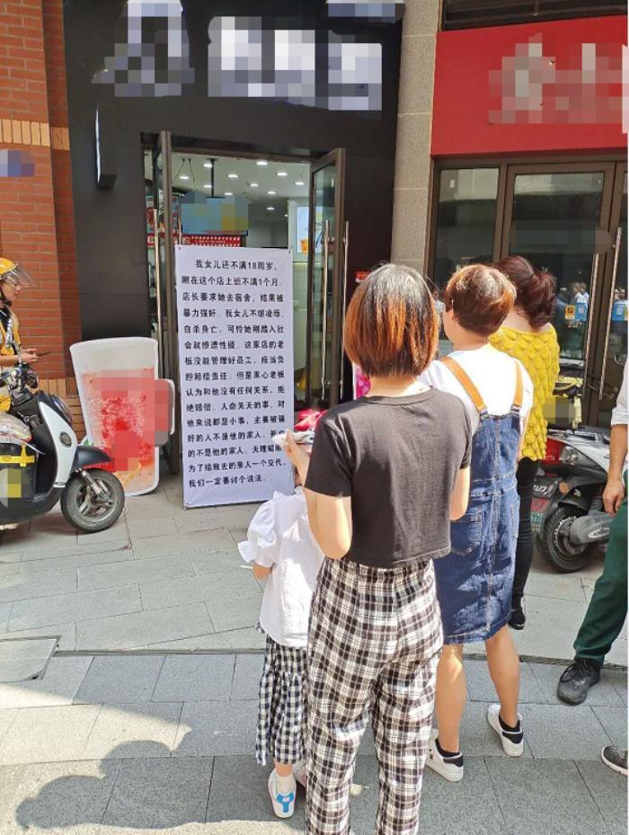 10月1日,许春风带领家人到奶茶店门口放了一个易拉宝告示牌。告示牌上内容写着:“……店长要求我女儿去宿舍,结果她被暴力强奸。我女儿不堪凌辱,自杀身亡……这家店的老板没有管理好员工,应当负担赔偿责任。但是黑心老板认为和他没有任何关系,拒绝赔偿……”店铺老板报警后,当湖派出所民警在调解时建议许春风走法律途径。
