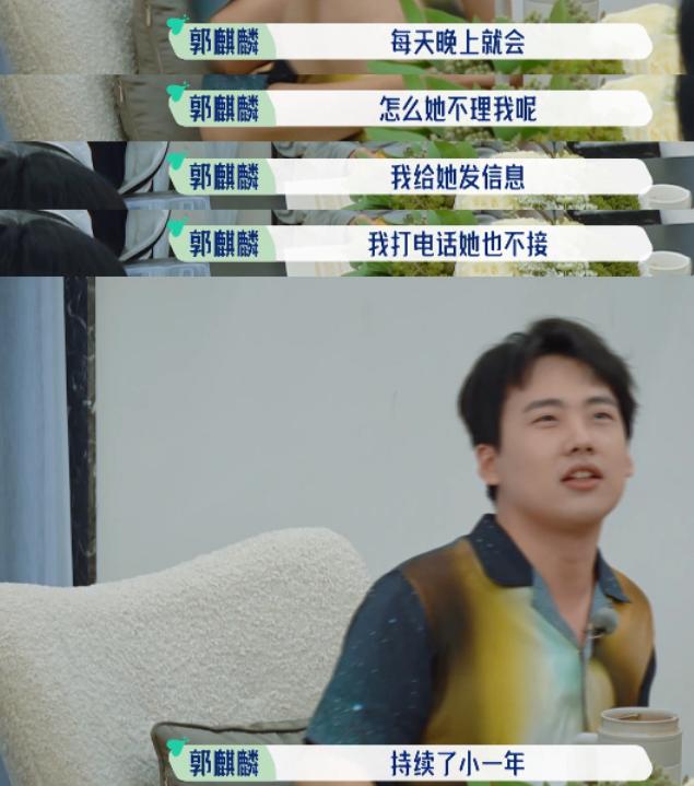 接着郭麒麟表示刚分手的时候没什么感觉,无所谓,但过了三个月之后,郭麒麟就开始给女生发信息,打电话,但女生都不理会,郭麒麟还表示自己当时很崩溃,开始痛苦了,每天晚上都会想她,一直持续了一年左右,