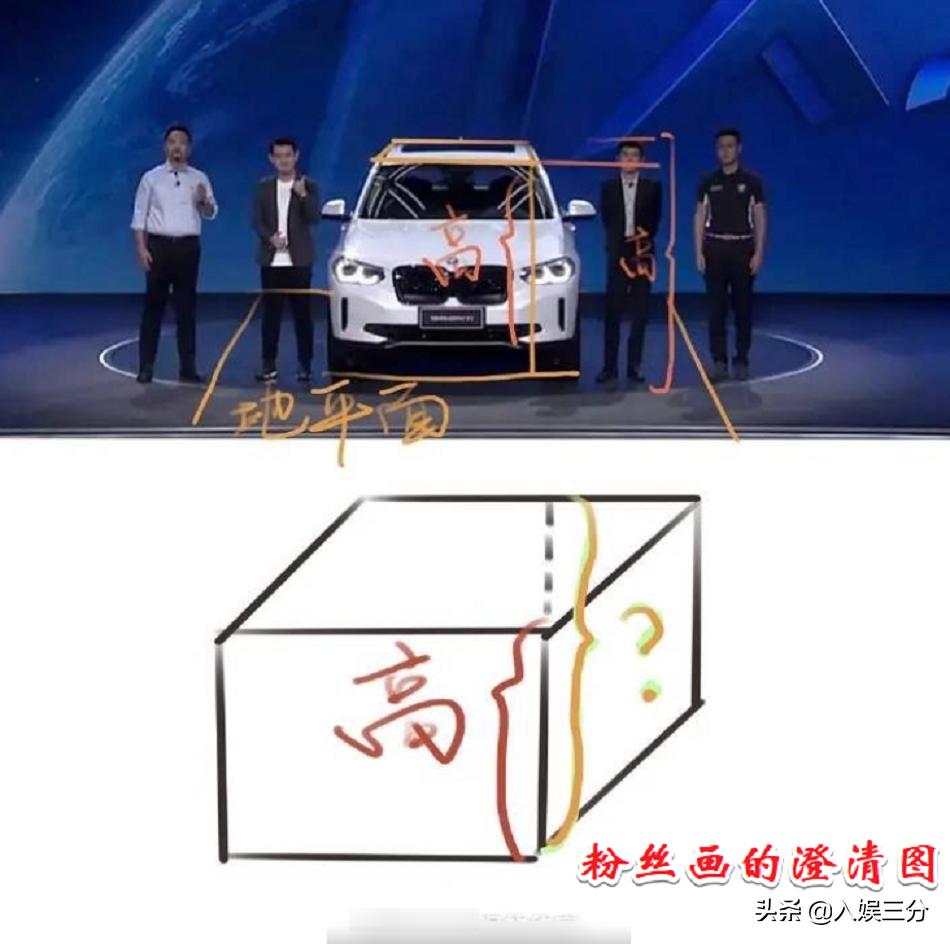 从粉丝画的澄清图可以看到,车子的高度其实是需要从前框开始计算的,如果以习惯视觉来看,可能会从车身中间或者最后来看,但是图片本身就是带有角度的,也没能完整地展示一部车的高度,所以在这中间就不免出现误差。