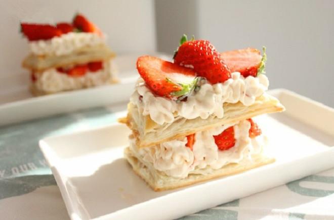 9、在最后一层的酥皮上,摆上整颗草莓作为装饰,美味又精致的草莓拿破仑就做好了。
