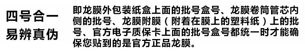所谓的四码合一,是官方认可的一种辨别龙膜真伪的办法。那么消费者可能不明白,四码是指哪几个?首先上膜盒上面的批号,以及膜筒内侧的批号,还有覆膜上面的批号,最后一个码指的是电子质保上的批号,这四个码一一对应证明我们所贴的龙膜是正品