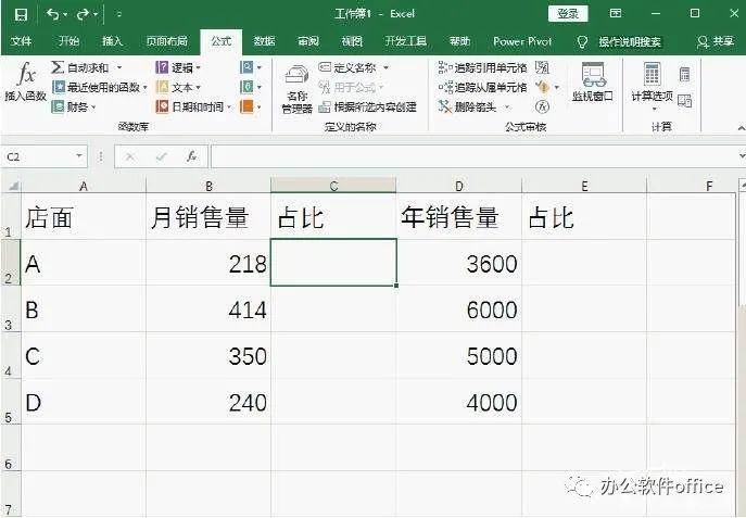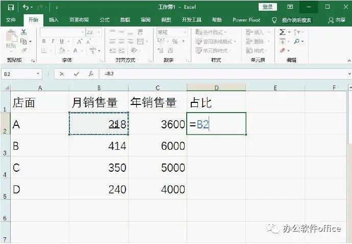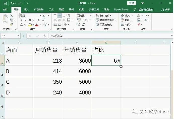 1、计算员工月销售量和年销售量的百分比。在单元格D2中输入“=B2/$C$2”,然后点击回车键就可以了。