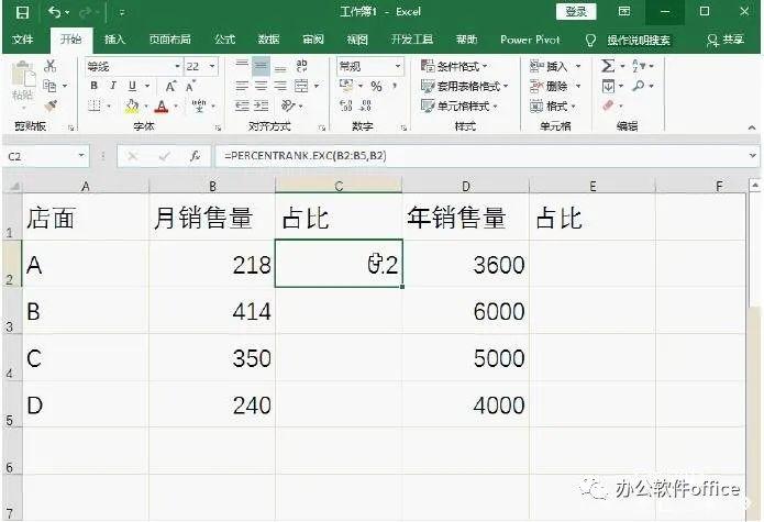 1、计算每个员工月销售量占整个月销售量的百分比。在单元格C2插入函数PERCENTANK.EXC,然后在“函数参数”界面中计算就可以了。