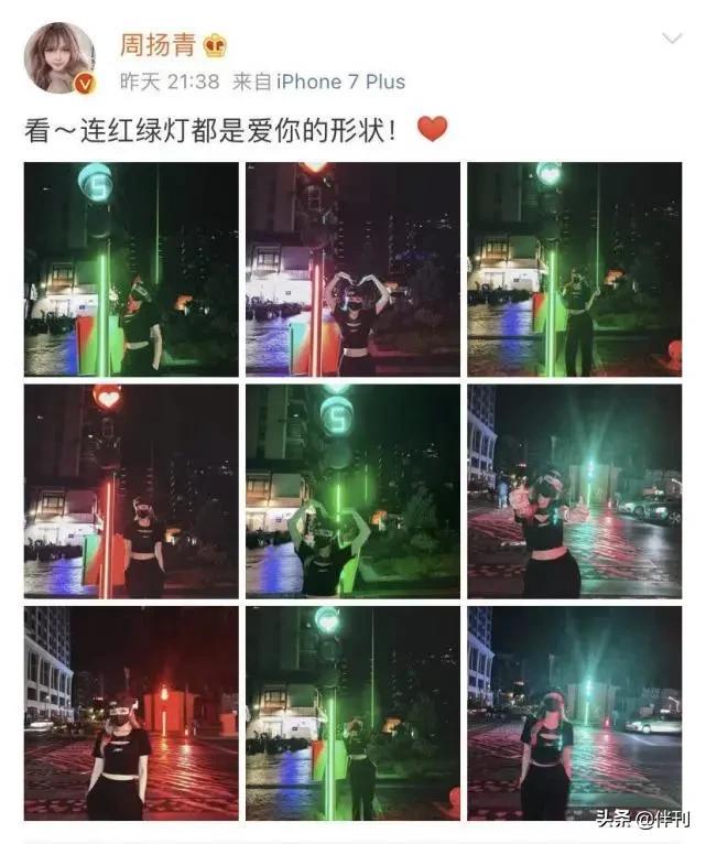 而这样的传闻刚一曝光,周扬青更是大大方方地在微博上晒出了自己和心形红绿灯的自拍照,并且配文“连红绿灯都是爱你的形状”,颇有一种默认的意味。