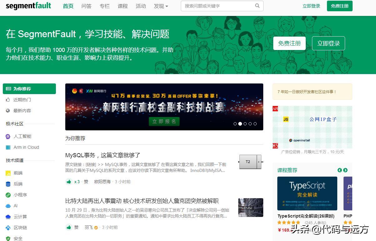 SegmentFault ( www.sf.gg ) 创立于 2012 年 是中国领先的开发者社区。为中文开发者提供一个纯粹、高质的技术交流平台,与开发者一起学习、交流与成长,创造属于开发者的时代!其目标是覆盖和服务1000 万的开发者,帮助解决各种各样的技术问题。并助力他们在技术能力、职业生涯、影响力上获得提升。