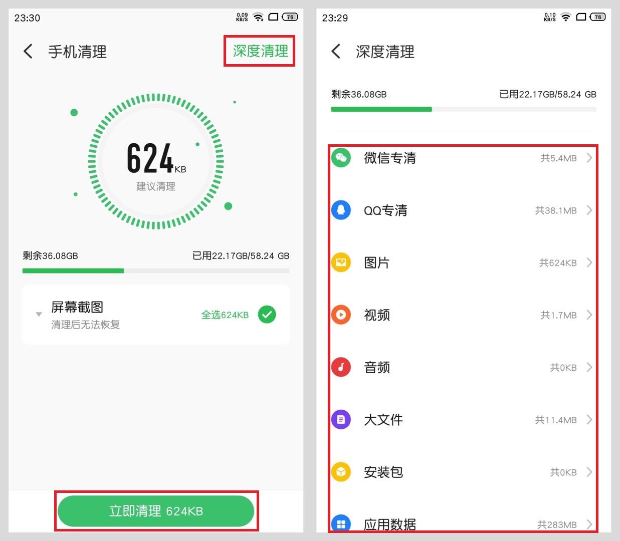 2、其实正确的做法是点击【手机清理】,扫描垃圾一键清理,然后再点击【深度清理】,可以清楚的了解手机内存情况,选择需要清理的各类文件。