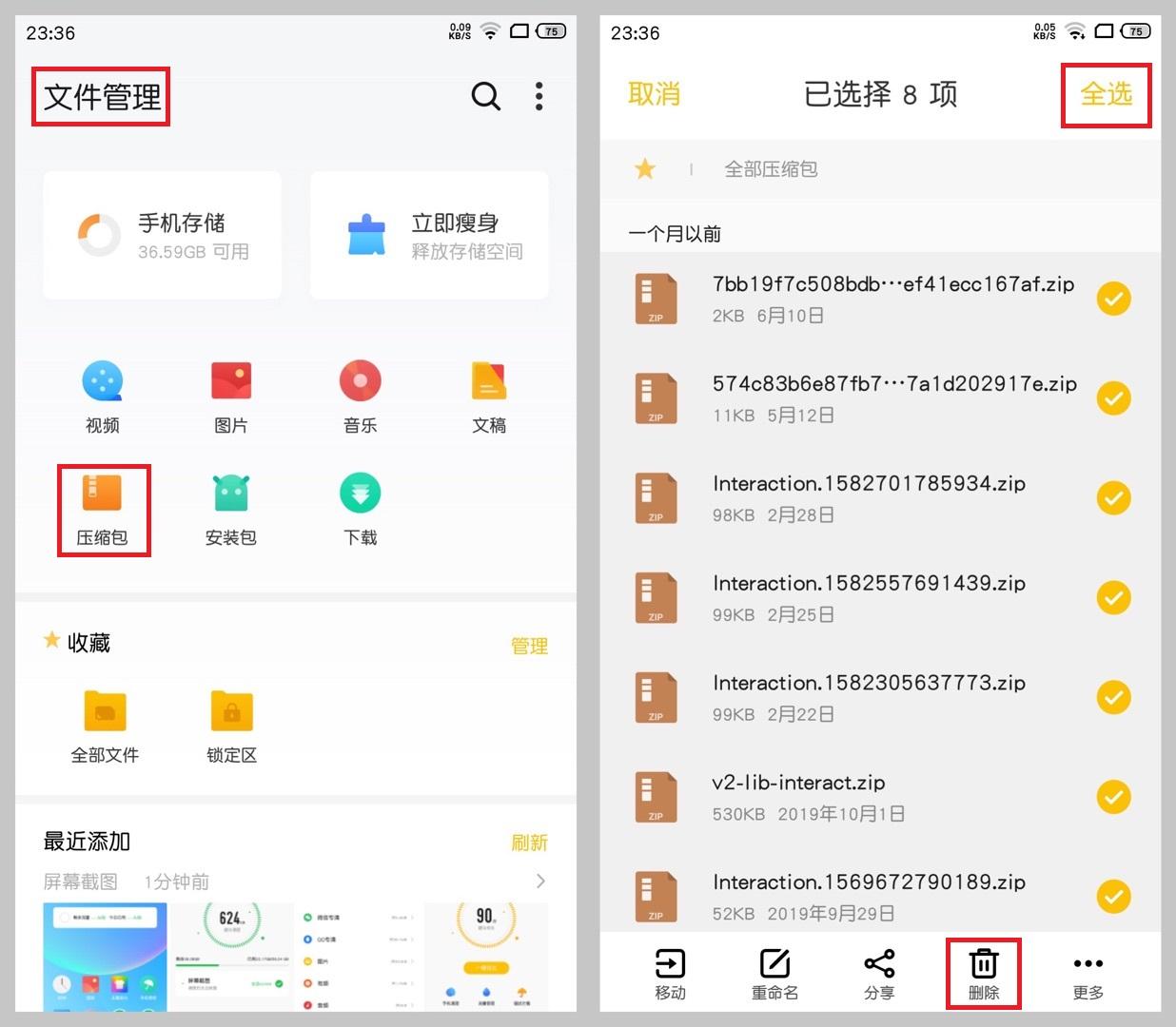 3、接着打开手机自带的【文件管理】,文件夹都是英文,如果看不懂就不要乱删除,可以选择【压缩包】,打开后全选压缩文件,将它们全部删除。