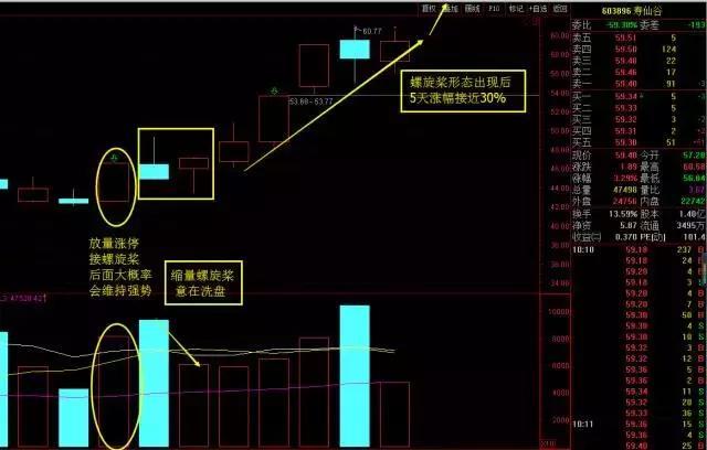 寿仙谷,题材方面具有高送转潜力,10月12日和18日两次涨停形成双神守门也是受此影响,随后两天K线形成螺旋桨形态,第一天放量冲高回落,次日下杀缩量拉回,我们注意到打下影线时缩量明显,且收盘为历史新高,这就为后面波段上涨埋下伏笔,5天涨幅接近30%的收益,堪称上升螺旋桨战法经典一役。