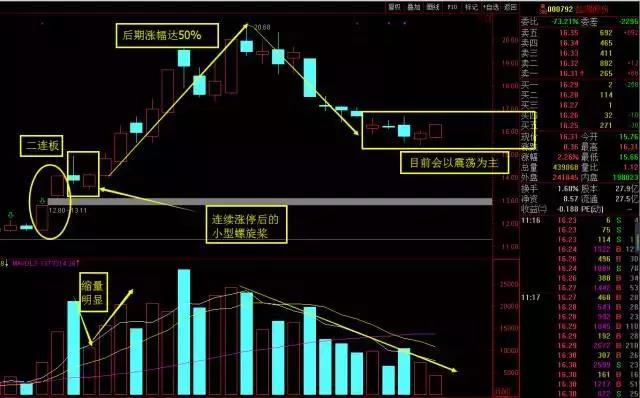 该股低位启动就连打两个涨停突破箱体,随后两天走出了不太标准的螺旋桨形态,首日冲高回落,不少人缴枪逃跑,次日调整没有大幅诱空,显得下影线不长,但缩量收出新高,不标准但整体走势一样是上升螺旋桨形态,该股随后得到资金追捧,顺利成为板块龙头,短短10天竟然达到50%的涨幅,将上升螺旋桨战法演绎得淋漓尽致。
