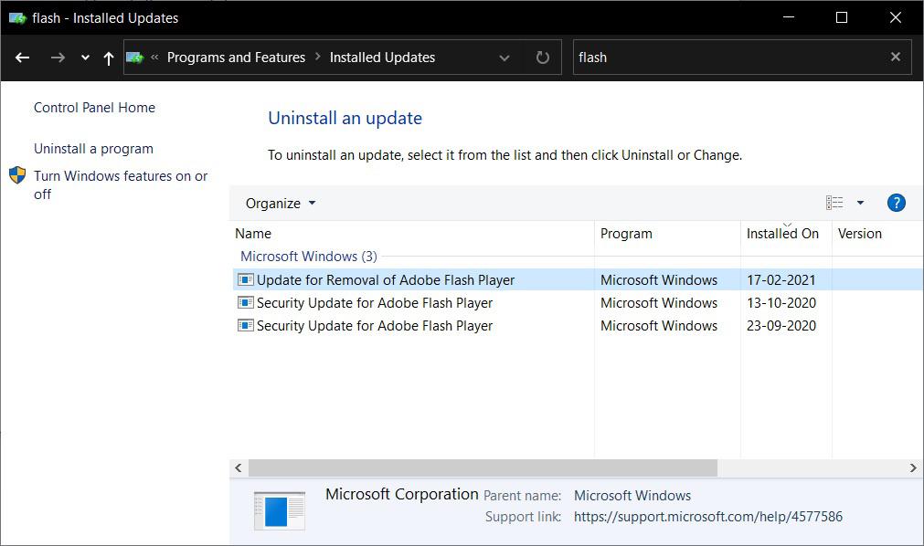 正如在截图中看到的,这个补丁不能被手动删除,但用户仍然可以通过使用早期的系统还原点或“重置此电脑”功能来恢复 Flash Player。