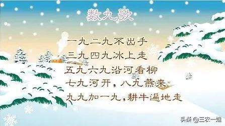 但是绝大部分地方是从冬至这一天算起,冬至到来了,也就意味着进入了数九的天气。也就是冬至是“一九”的第1天,以后论推,按照这个推法,你今天就是“二九”的最后一天,明天是“三九”的第1天。