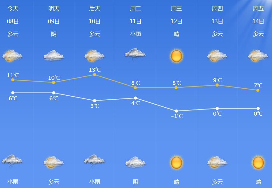 1月8日:多云夜里转阴;3℃-11℃