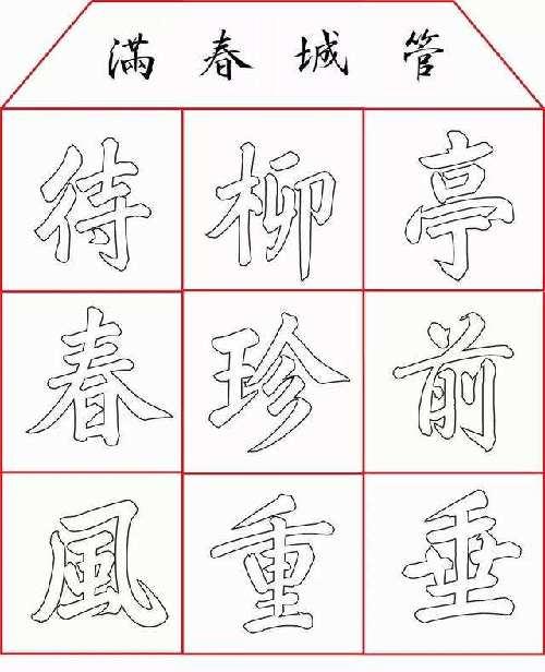 文字图式的“九九消寒图”一般是九个九画字联成一句,最常见的有:“亭前垂柳珍重待春风”、“春前庭柏风送香盈室”等。自冬至开始,每天涂一笔,八十一天全部写好后,寒去暖来。
